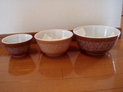 3つそろえるとますます可愛いオールドパイレックスのボール。シックな感じのウッドランドは中々手に入りません。